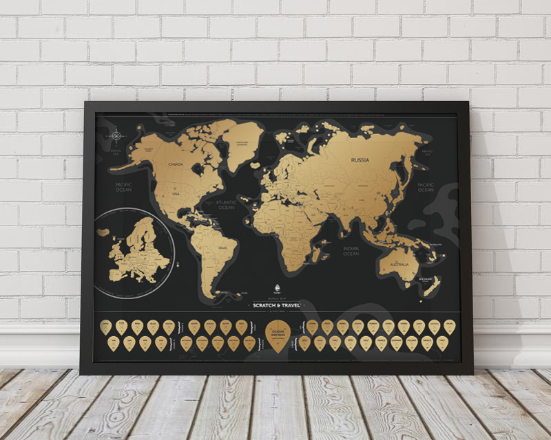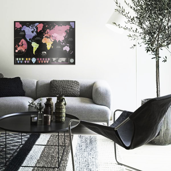 Zdrapywalna mapa jest przede wszystkim mapą świata jak i wspaniałą ozdobą każdej ściany. Mapa pokryta jest złotą folią, pod którą kryje się estetycznie wykonana mapa świata. Wystarczy zdrapać złotą warstwę z odwiedzonego miejsca i pokazać historie swoich podróży.
